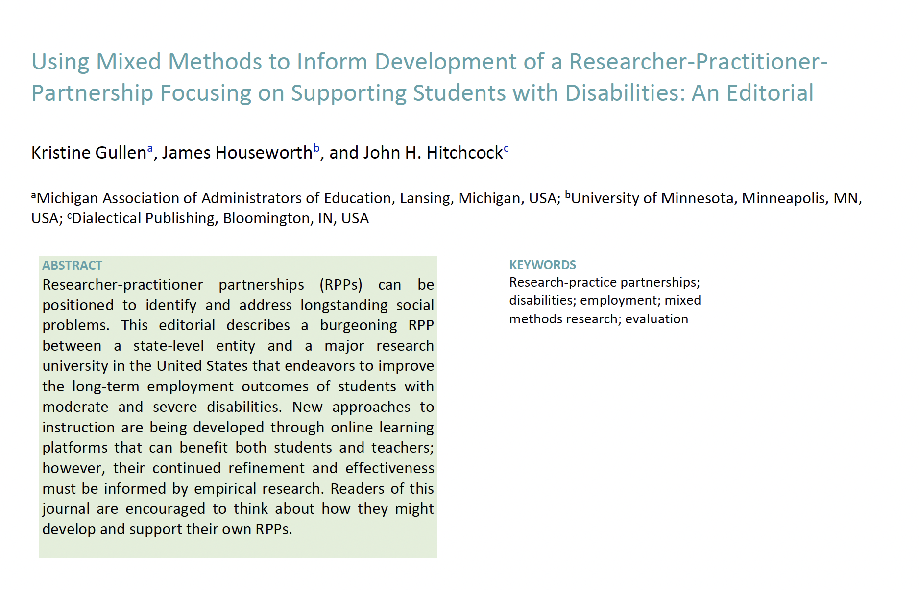 (a) Michigan Association of Administrators of Education, Lansing, Michigan, USA; (b) University of Minnesota, Minneapolis, MN, USA; (c) Dialectical Publishing, Bloomington, IN, USA